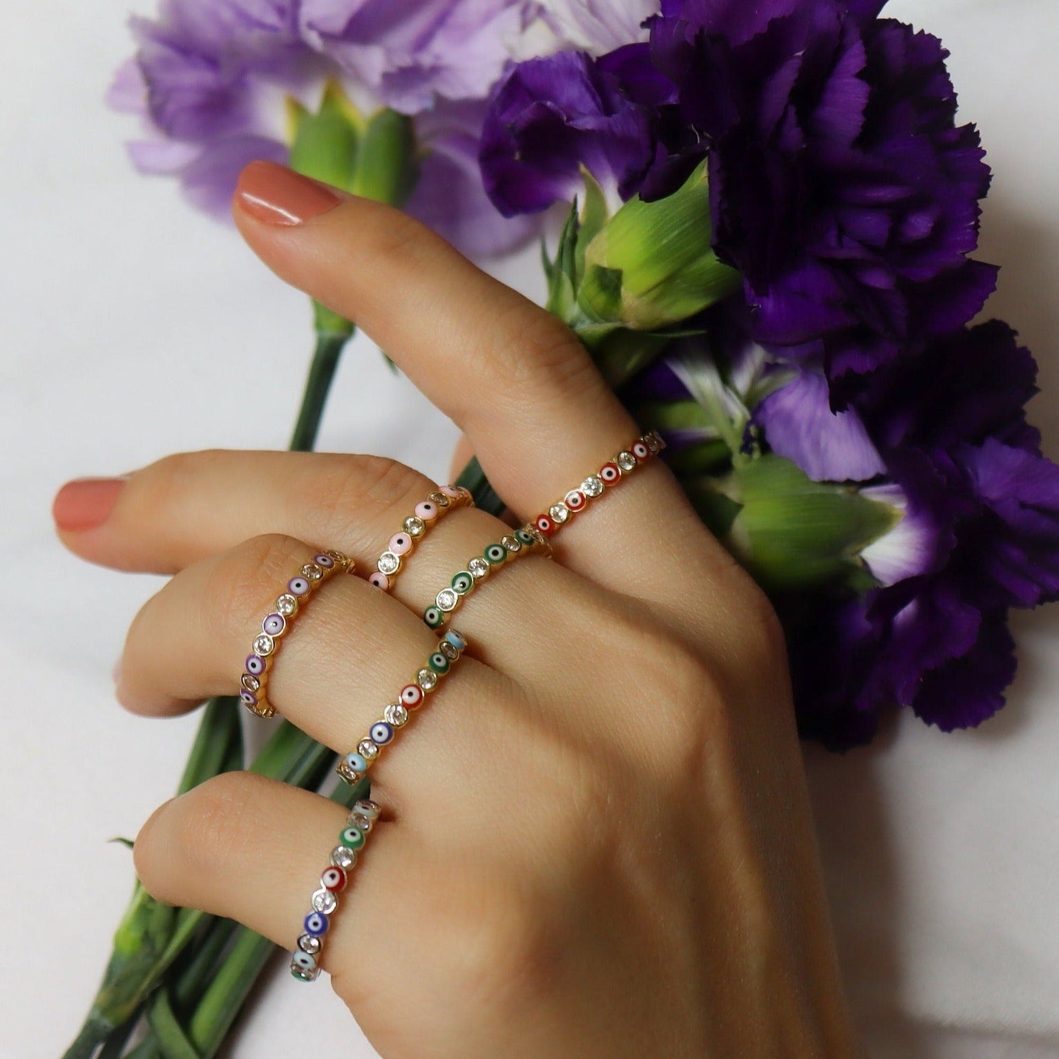 Our elegant evil eye ring is anti-tarnish, waterproof and has shimmering CZ crystals on 18K gold or silver material. The evil eye is a curse believed to be cast by a malevolent glare, usually given to a person when they are unaware. Many cultures believe that receiving the evil eye will cause misfortune. The Evil Eye ring is created to protect against the malevolent intentions. It will sit perfectly on your finger and become your favorite everyday companion. Evil Eye ring is perfect for combining with other rings. And the best part? It's 100% waterproof!